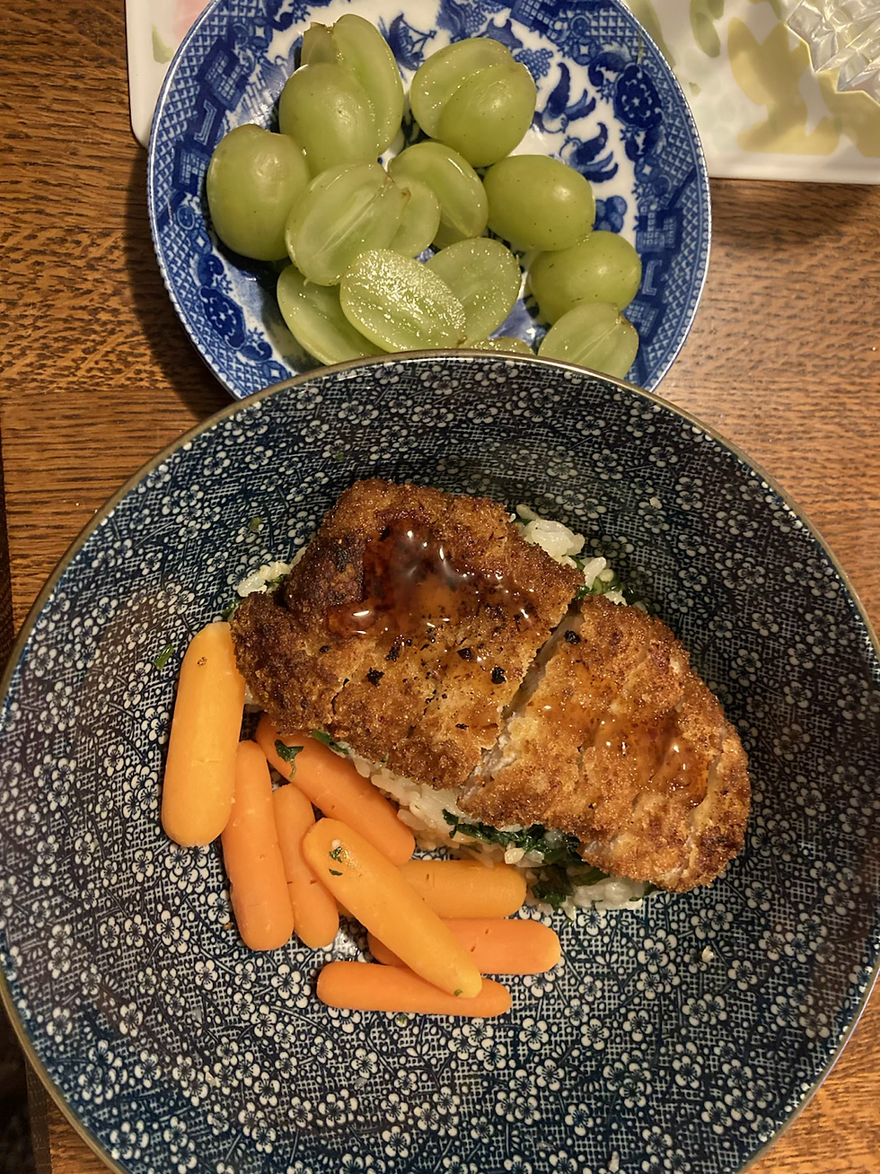 Rice and steamed spinach with a little soy sauce, panko and bread crumb crusted pork chop with steamed carrots and a little orange sauce.