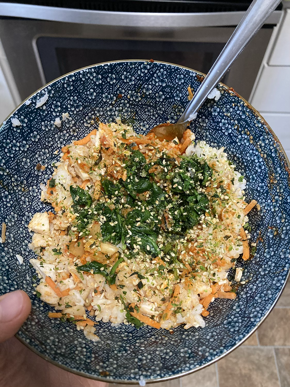 “Chicken Bee Bim Bop” Rice, steamed spinach, crisp carrots, furikake seasoning, rotisserie chicken, kimchi, and a dab of gochuchang.